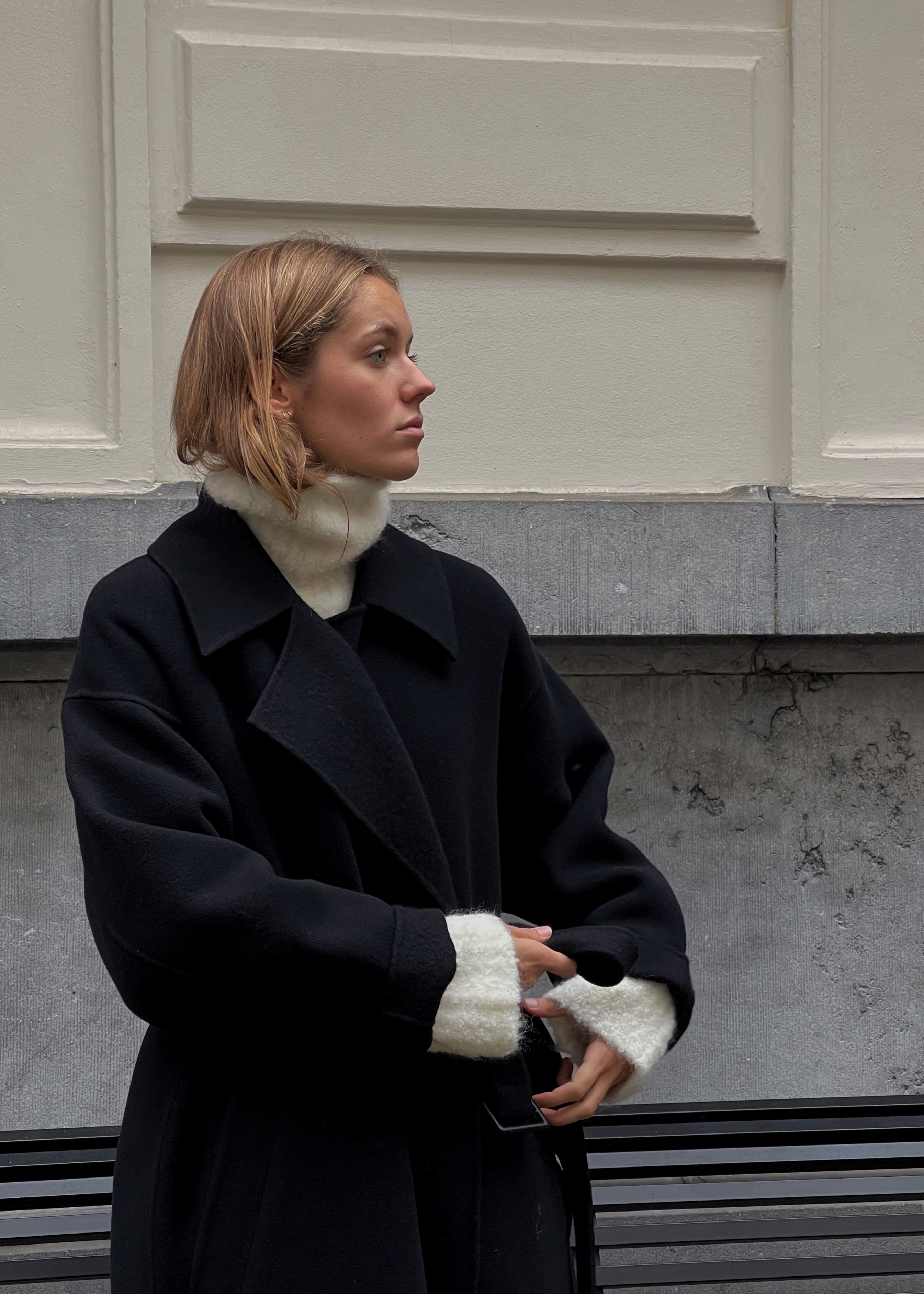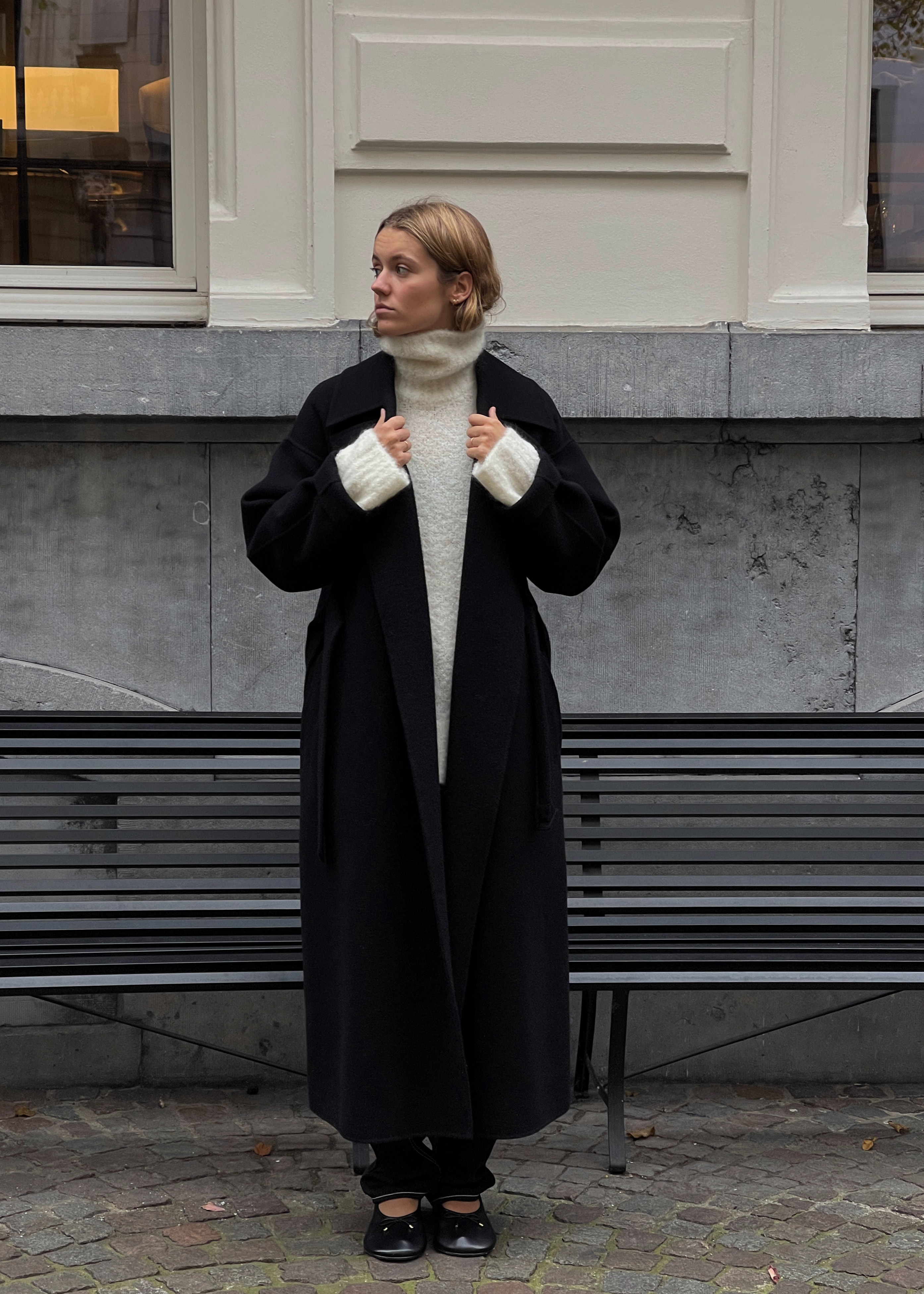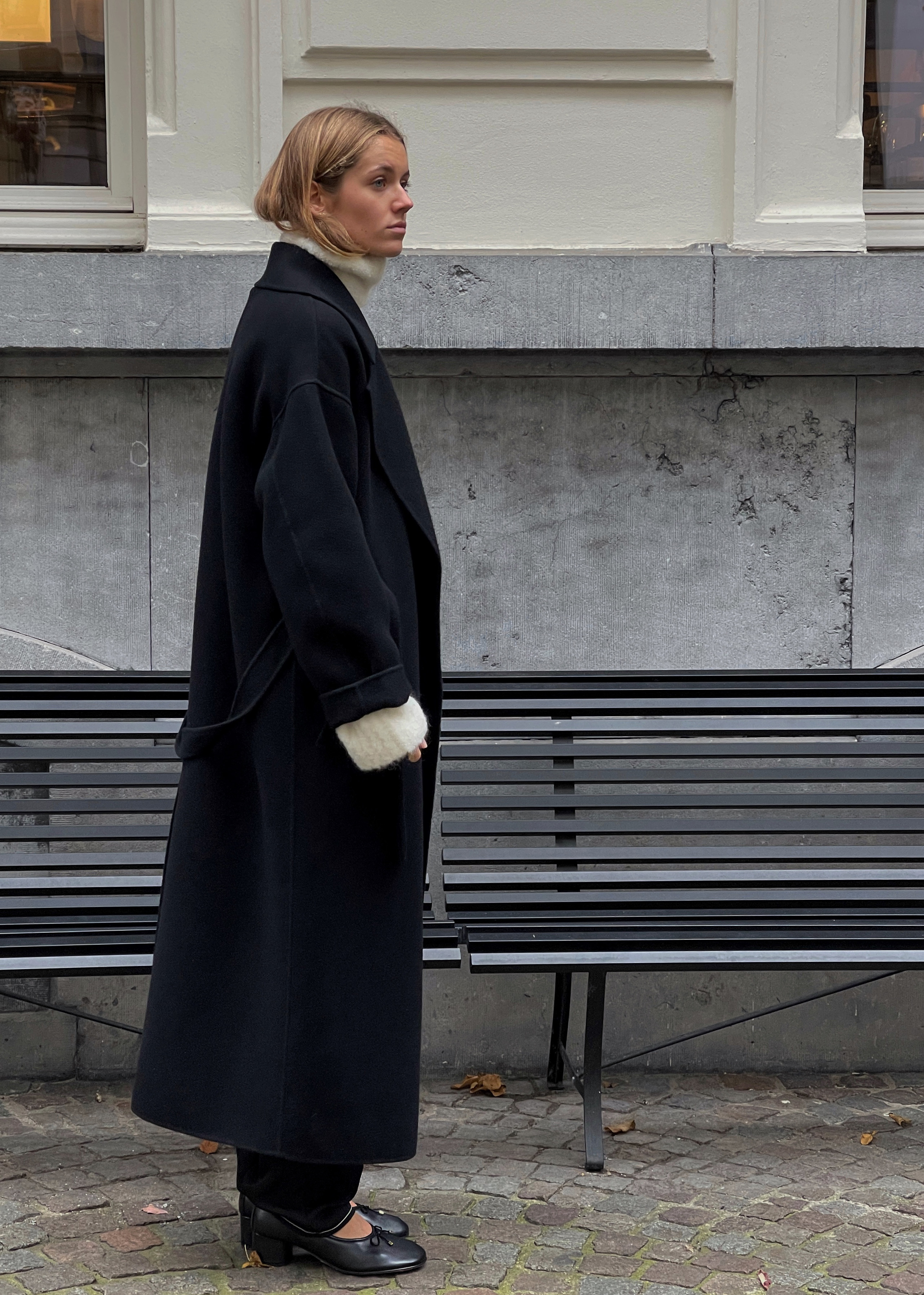 This Auralee coat is crafted from a luxurious wool blend with a soft, full-bodied drape. Its relaxed silhouette, wide lapels, and self-tie belt create an elegant, effortless shape. A timeless essential for the colder season.