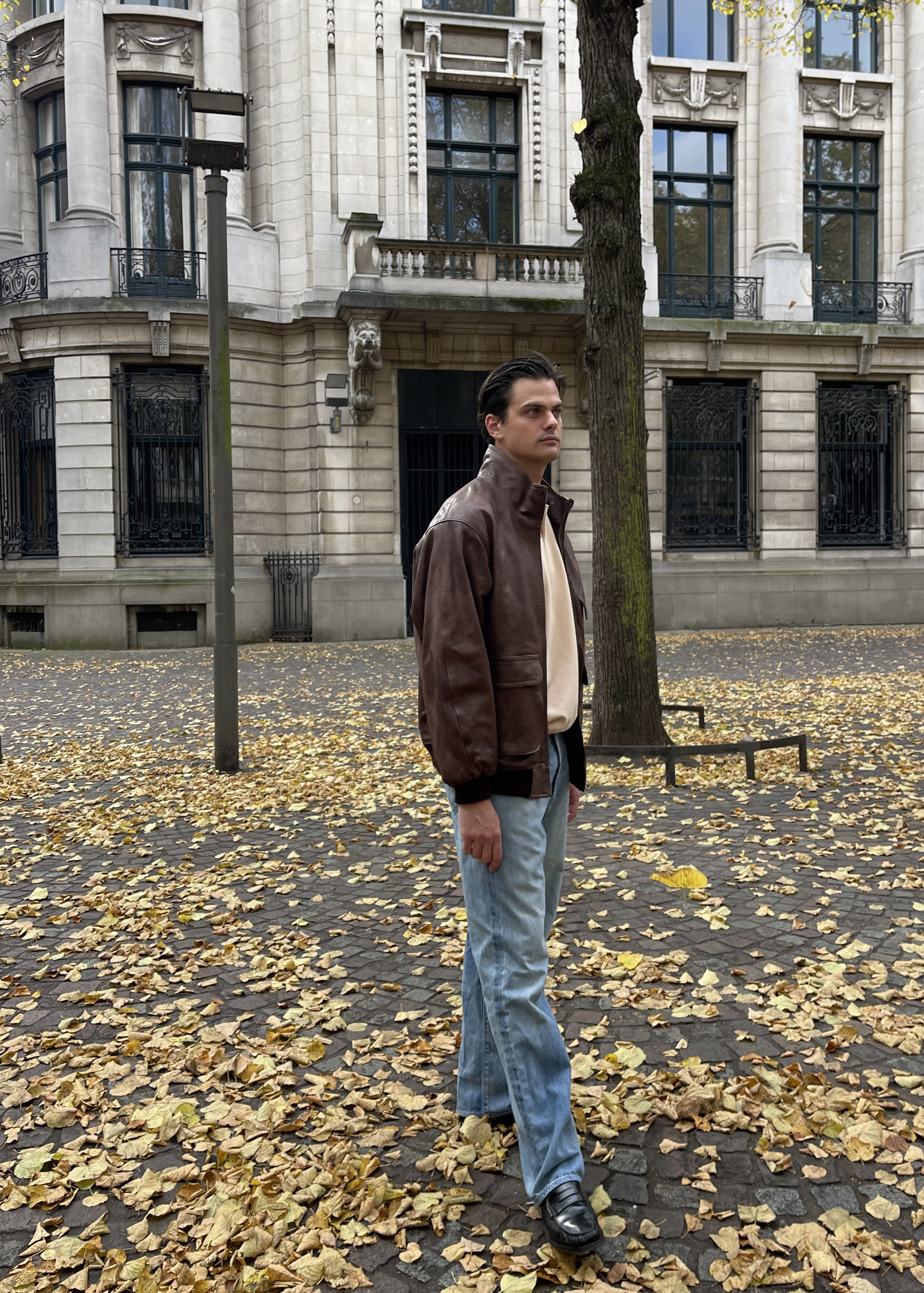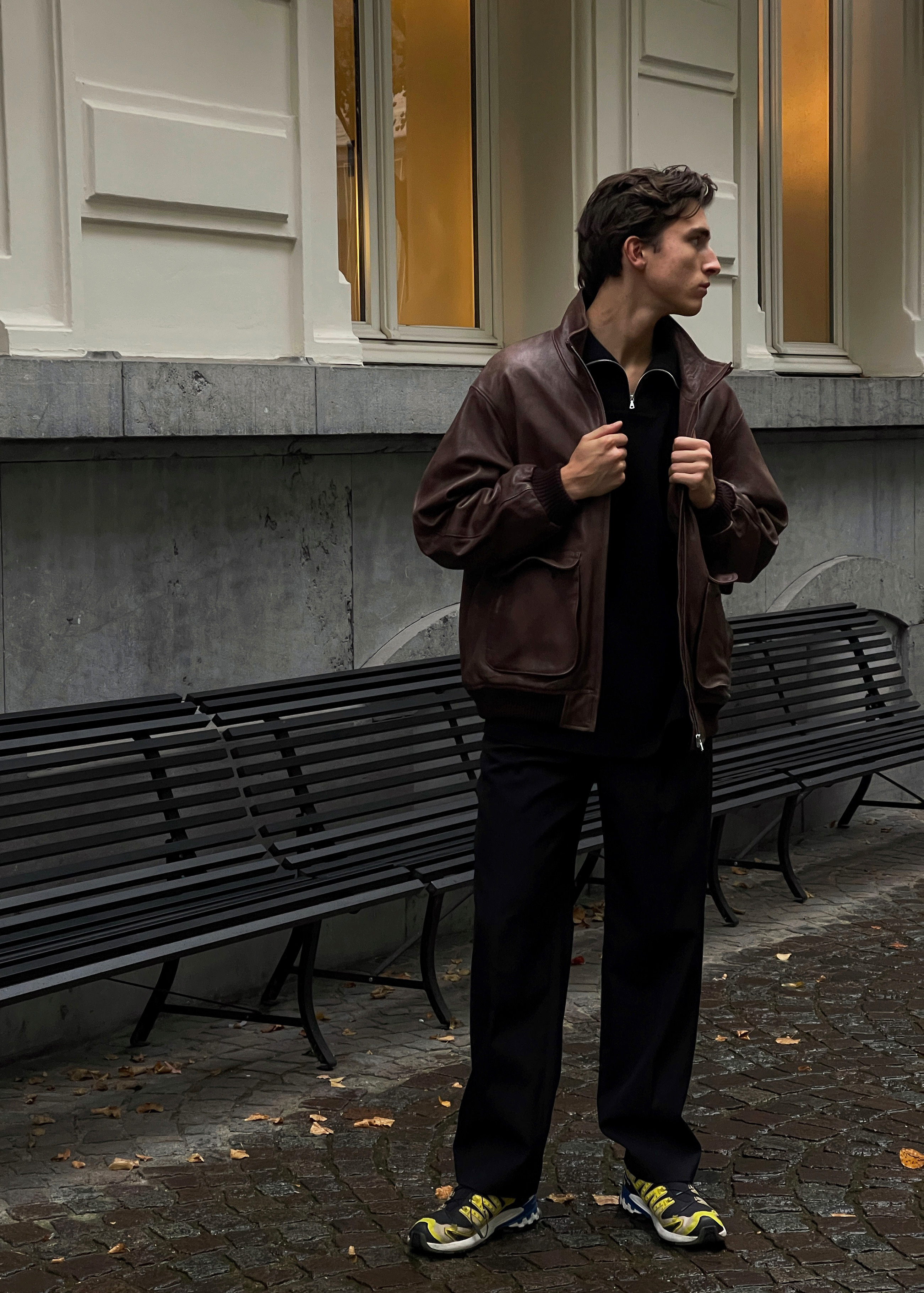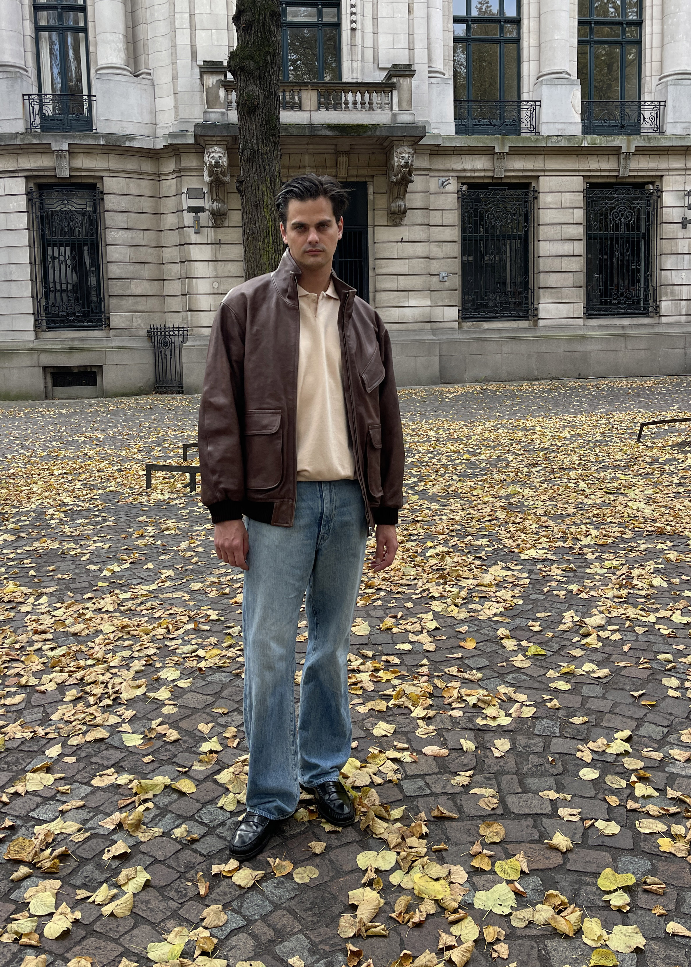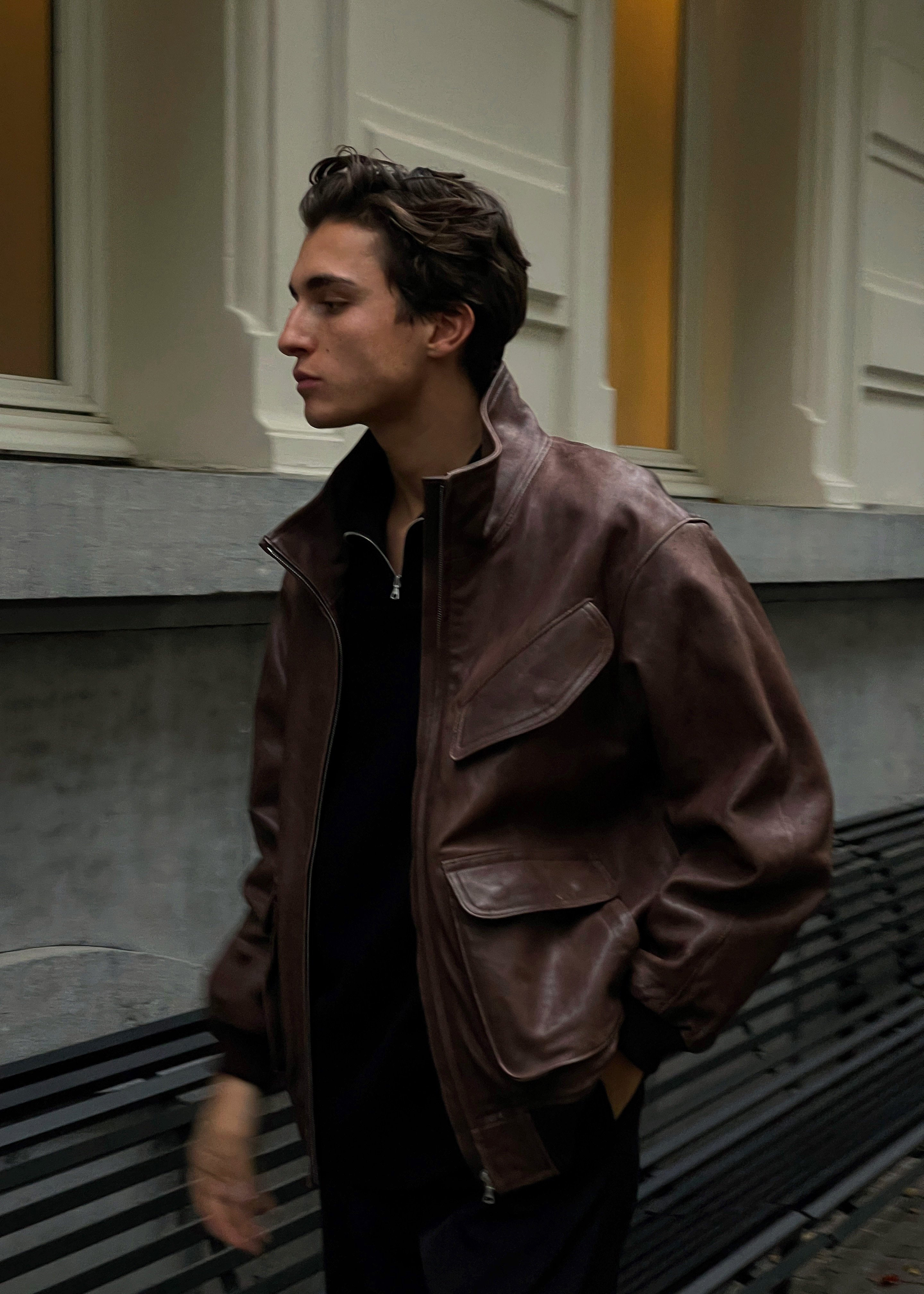 Crafted from supple lamb leather, this jacket reflects Auralee’s quiet refinement. With its relaxed fit, oversized flap pockets, and rich brown tone, it blends modern utility with timeless elegance. The leather softens beautifully over time, revealing a patina unique to its wearer.