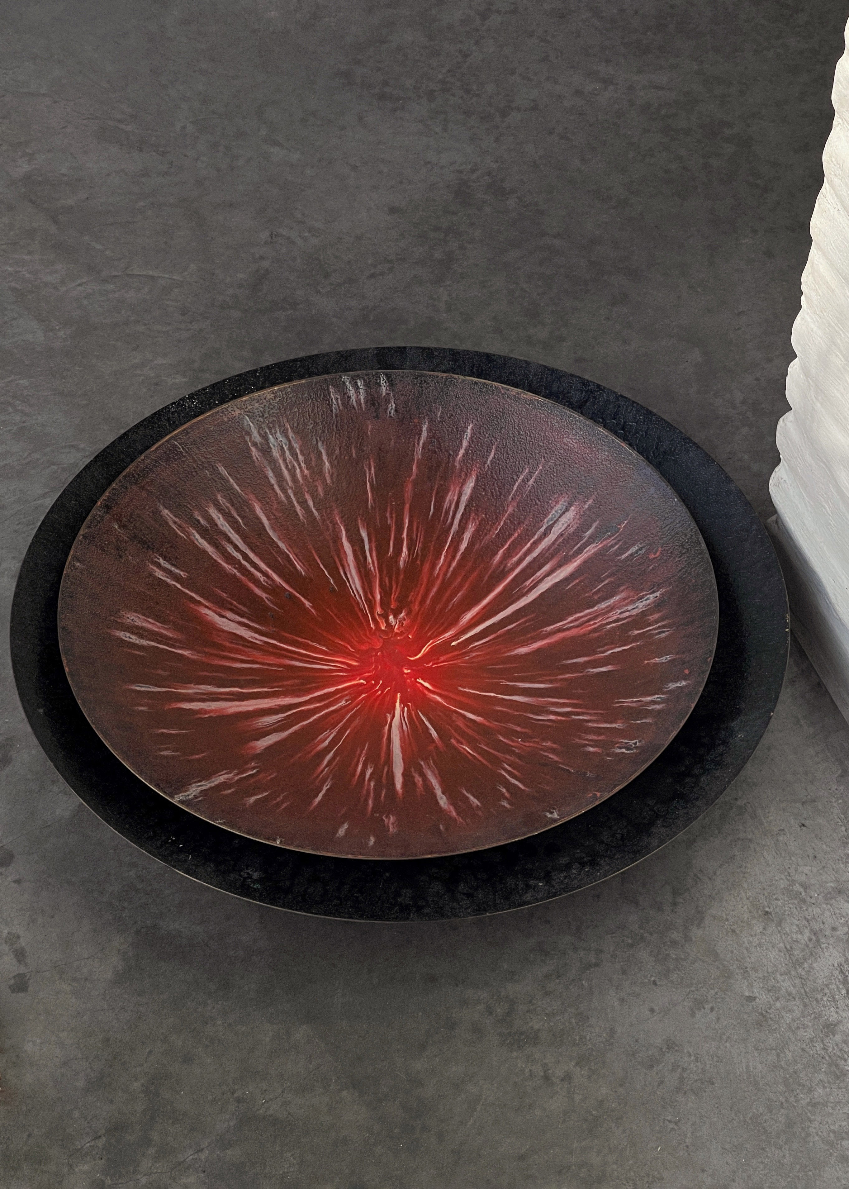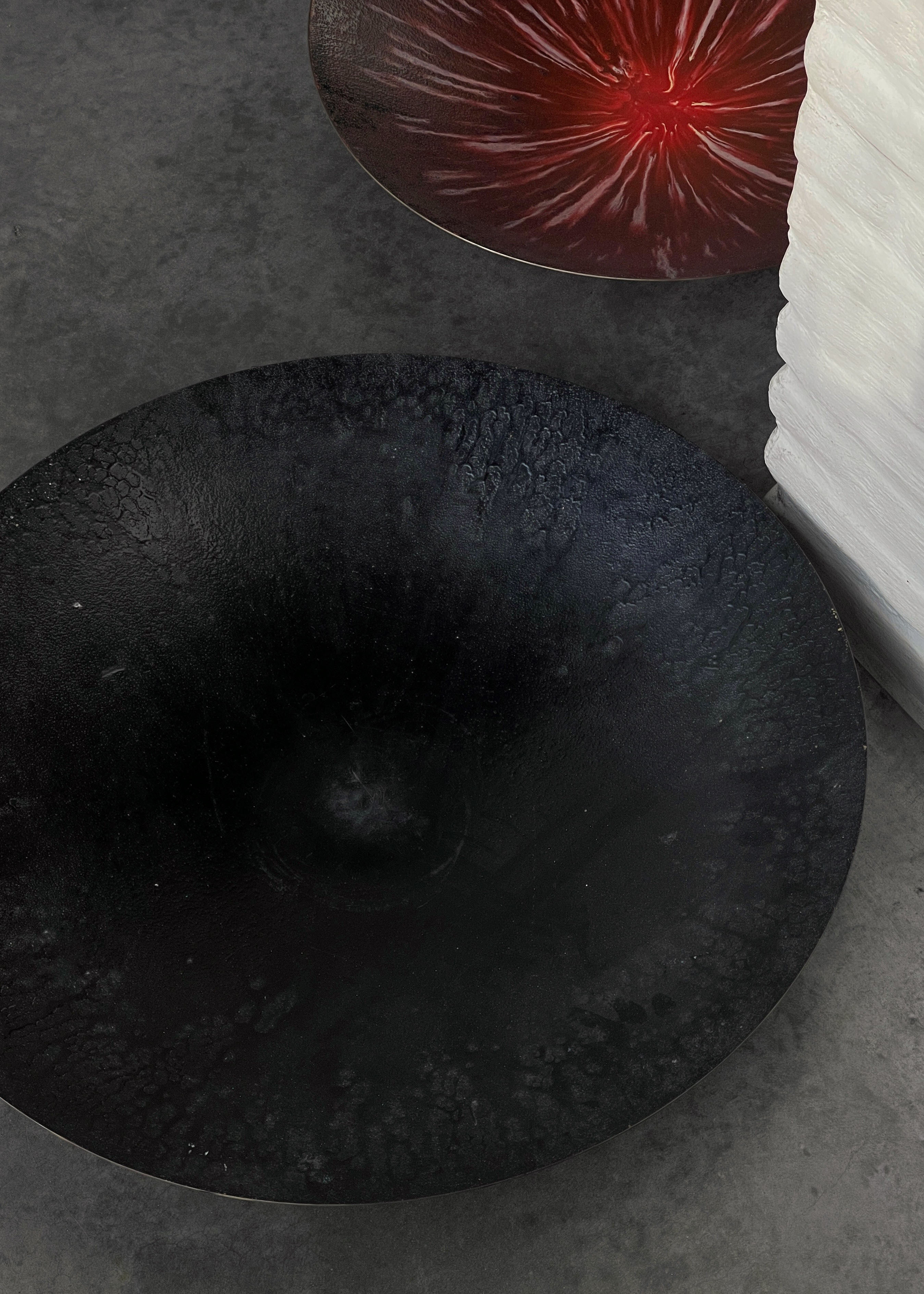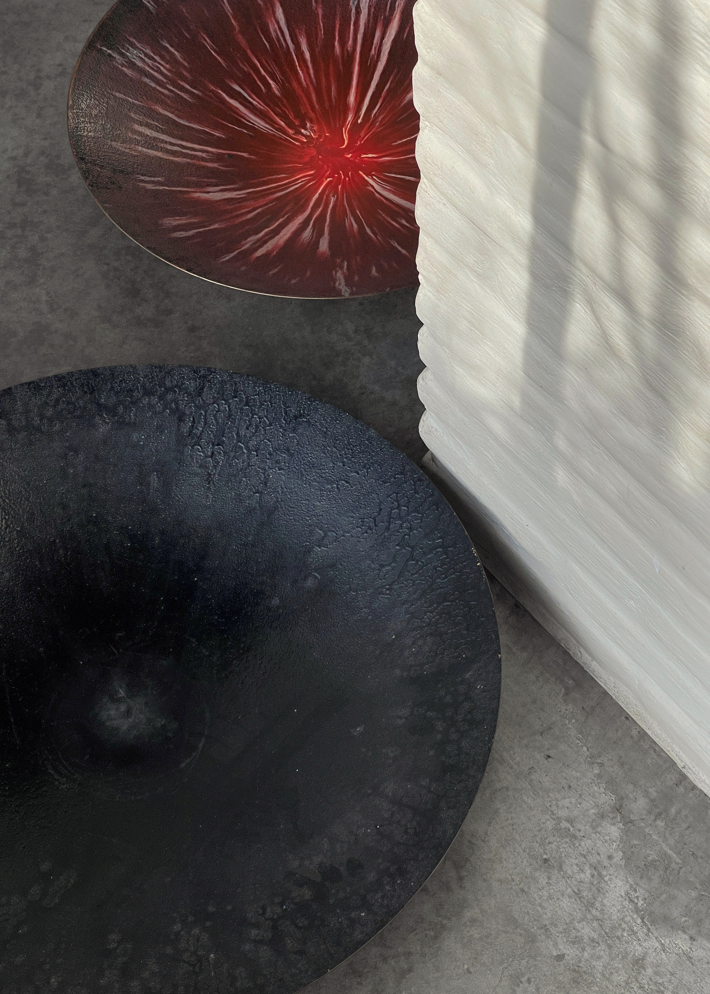 Handcrafted in Belgium by designer Michaël Verheyden, this sculptural brass bowl balances raw materiality with quiet refinement. Its deep, wide silhouette is finished in a matte black exterior. Every piece carries subtle variations in texture and tone, revealing the artisanal process behind it.