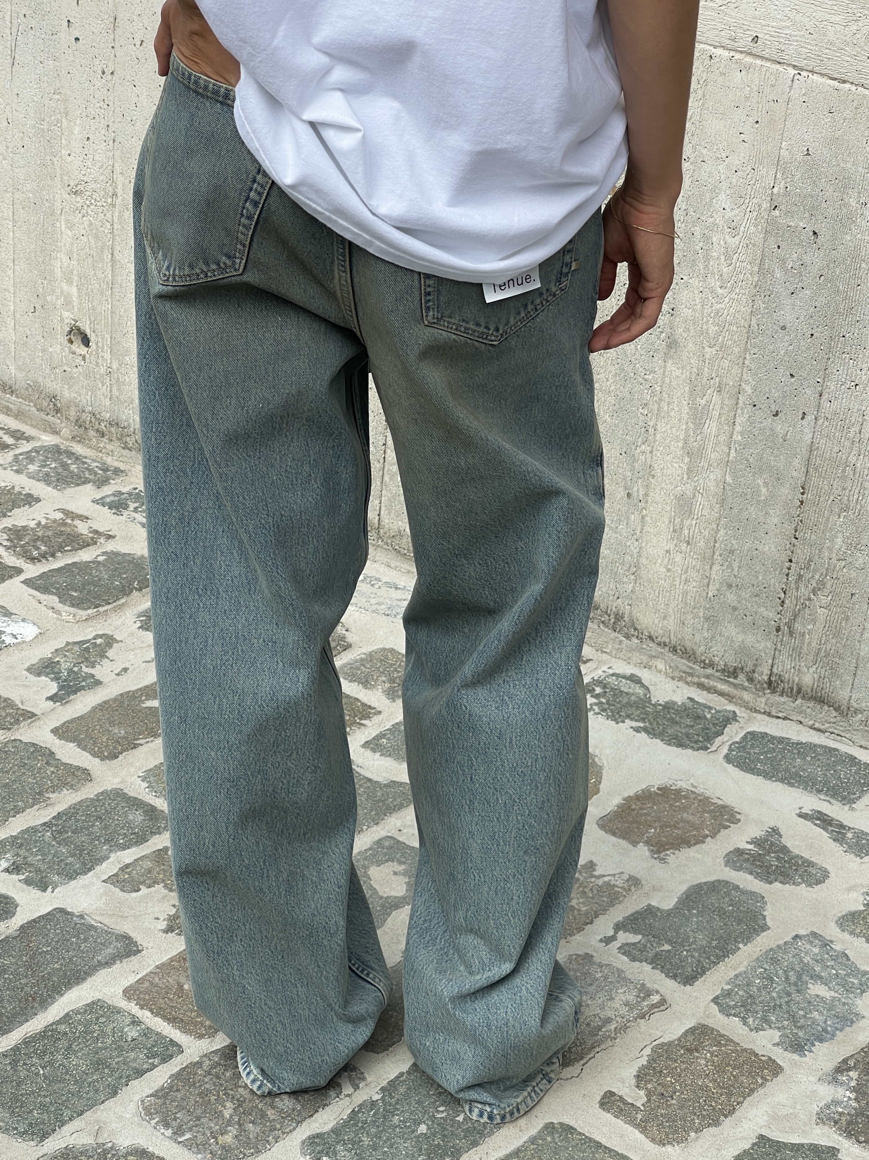 The unisex Tenue. Noah jeans feature a relaxed, baggy fit with a mid-rise and an extra-wide leg. Designed for an oversized silhouette, they are available in sizes XS to L. The Tenue. Noah Dirty Arroyo jeans are crafted from a durable 14.5 oz 100% organic cotton denim. Finished in the Arroyo wash with a subtle dirt effect, they take on a unique vintage-inspired beige tint.