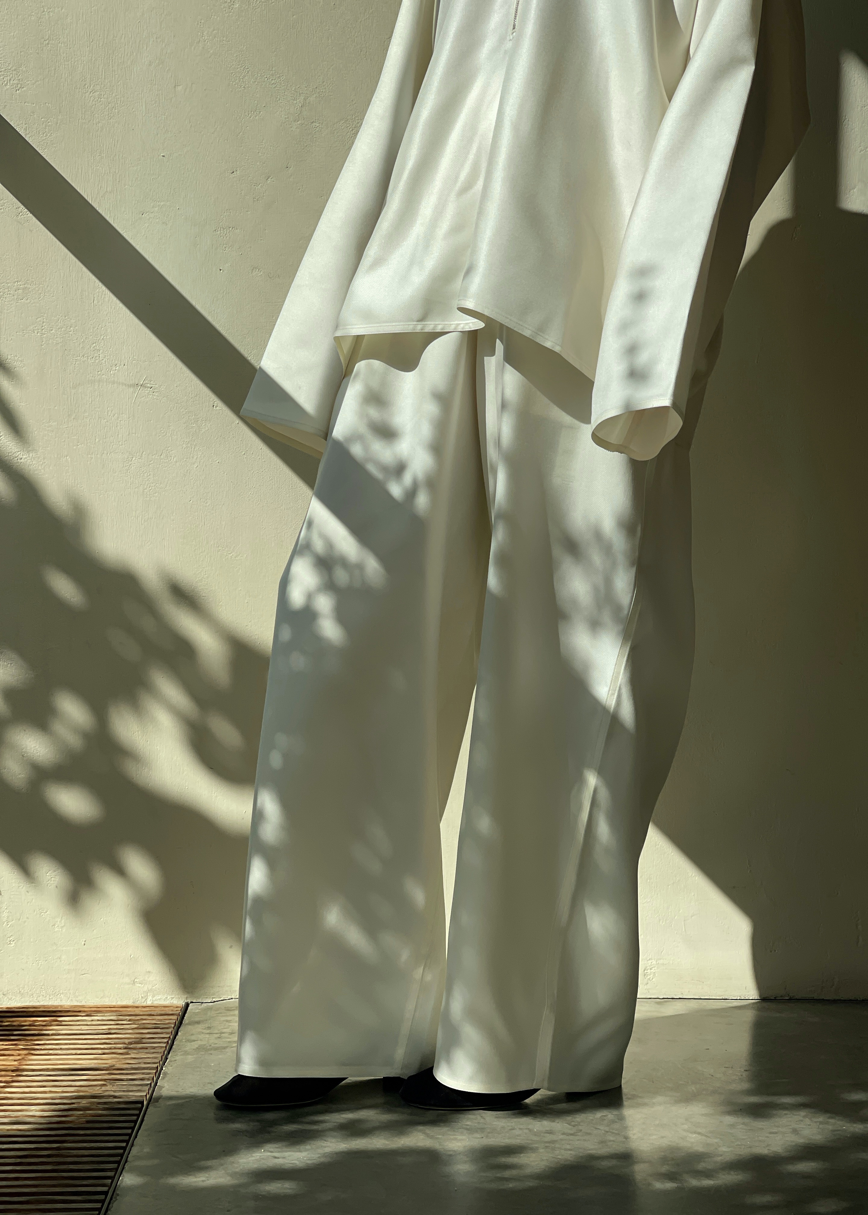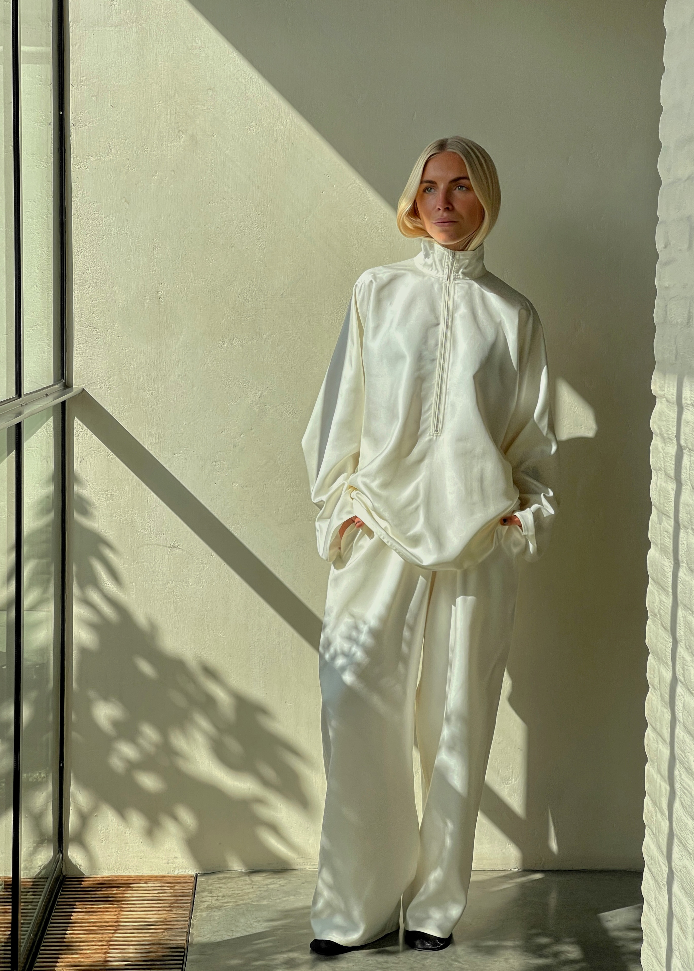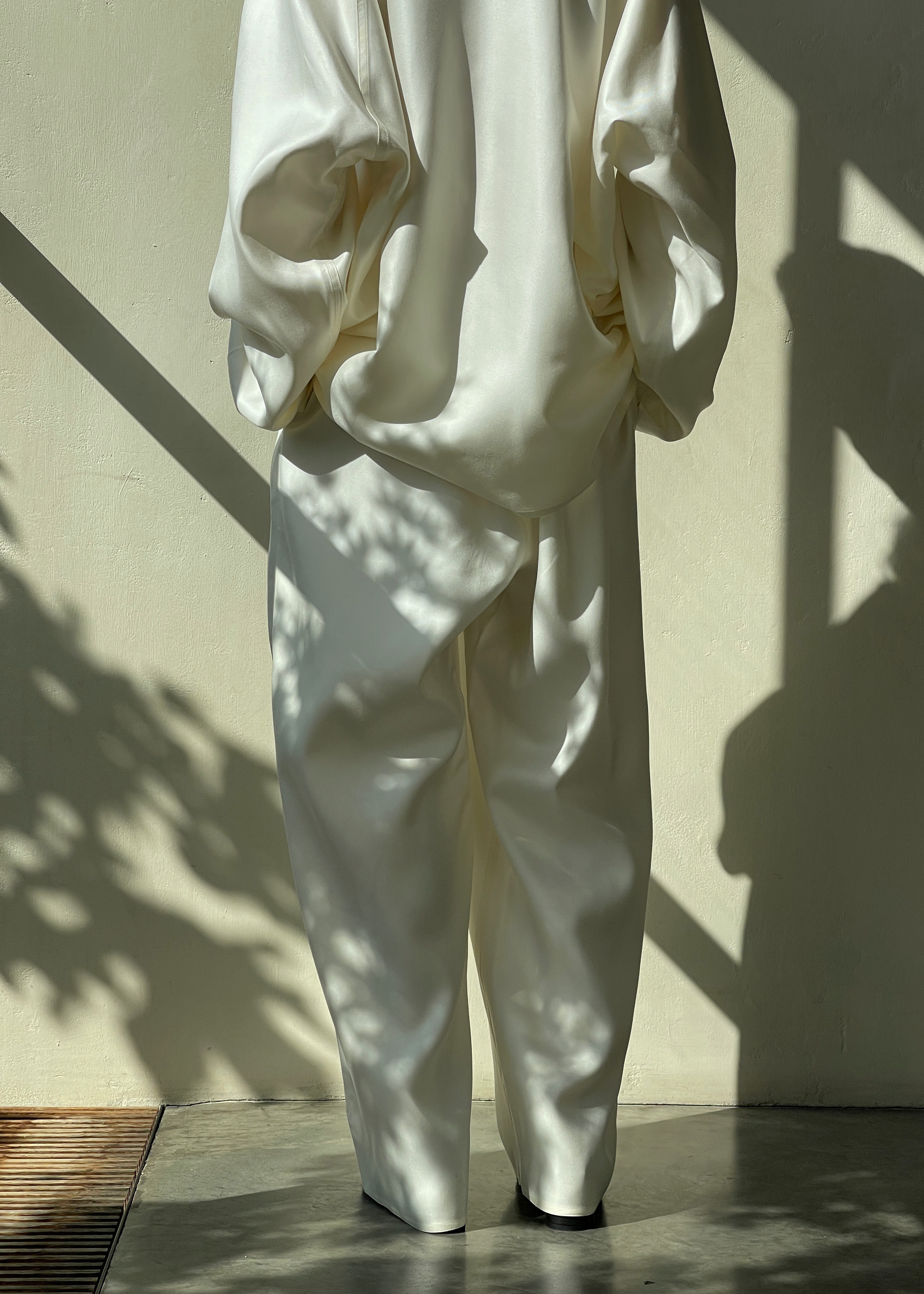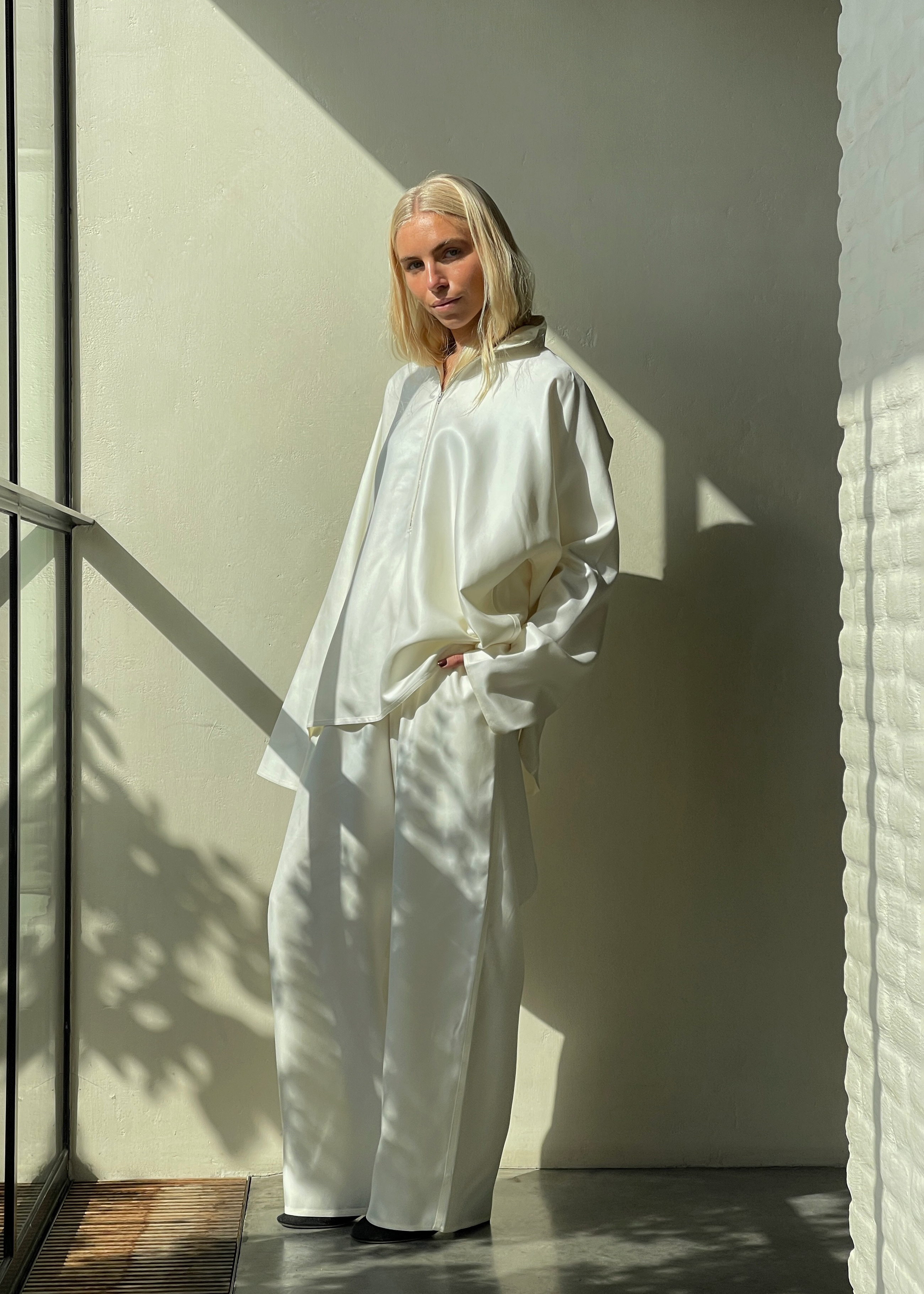 The Silk Pasch trousers by Sofie D’Hoore merge comfort with timeless elegance. Crafted from fluid silk with a subtle sheen, they move with ease while the elastic waistband ensures a relaxed fit. The wide, flowing silhouette exudes effortless refinement, making them a versatile choice for many occasions. Practical side pockets and a clean, minimalist finish enhance their wearability. In the shade ivoire, the trousers embody the pure aesthetic and meticulous craftsmanship that define Sofie D’Hoore.