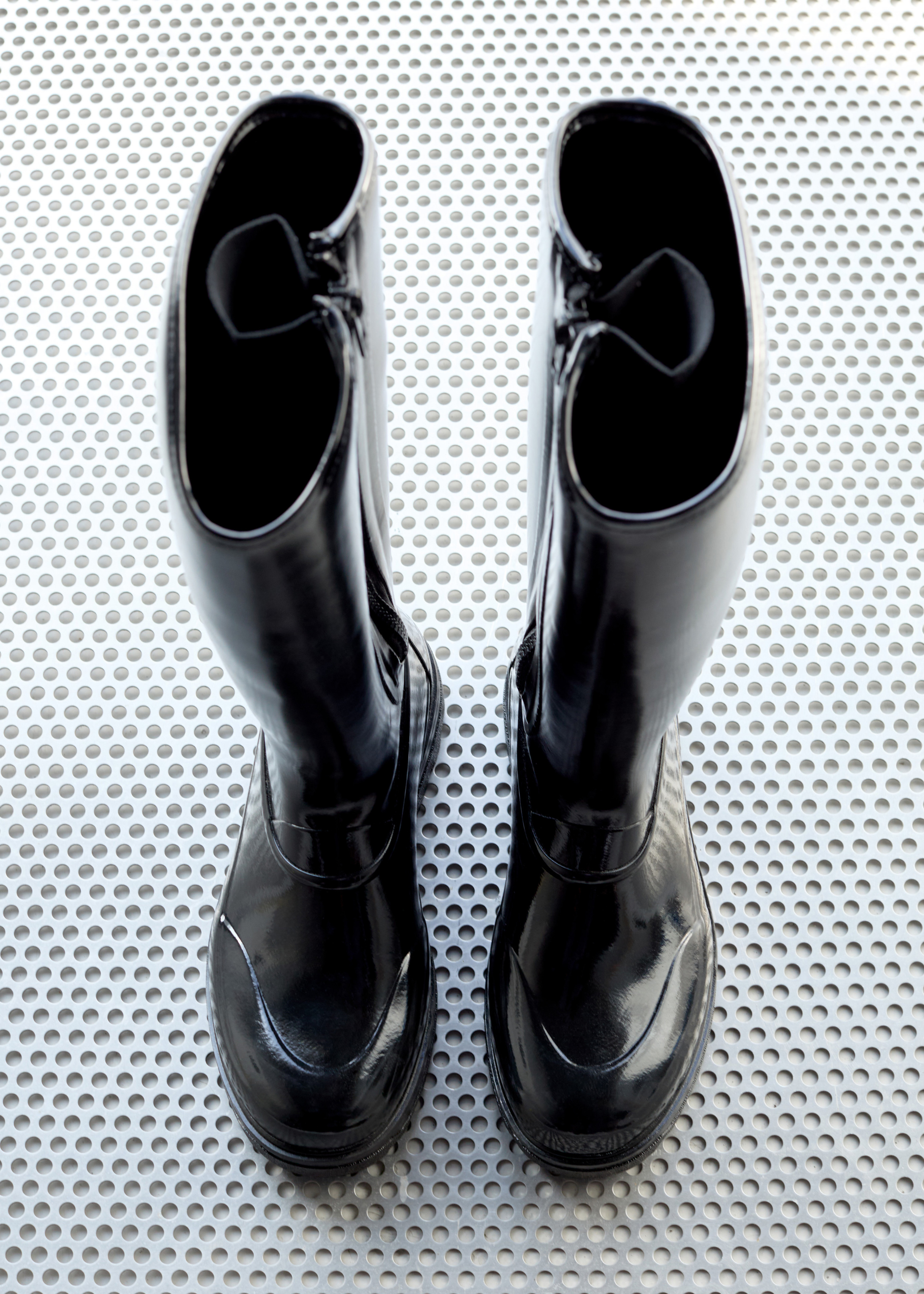 The collection launches with rubber footwear: lacquer-finished loafers and sculpted boots, crafted with TRETORN’s 130 years of expertise and refined through KASSL’s sharp, modern eye.